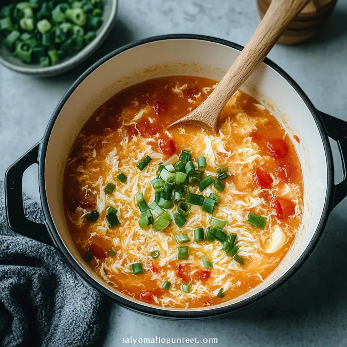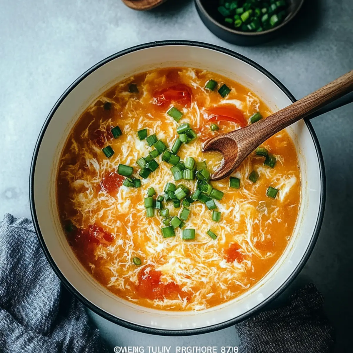 A comforting tomato egg drop soup that warms the heart, perfect for chilly nights.