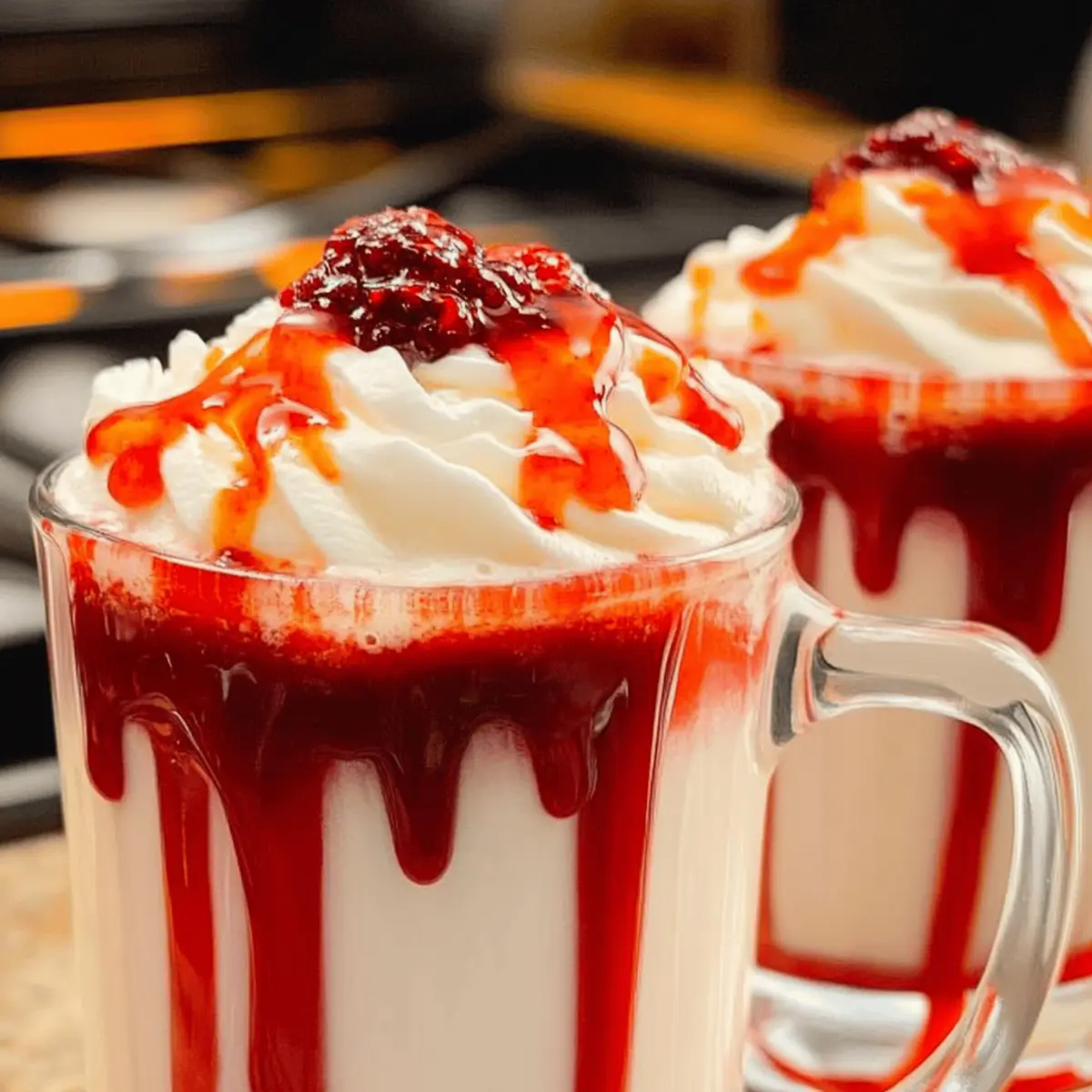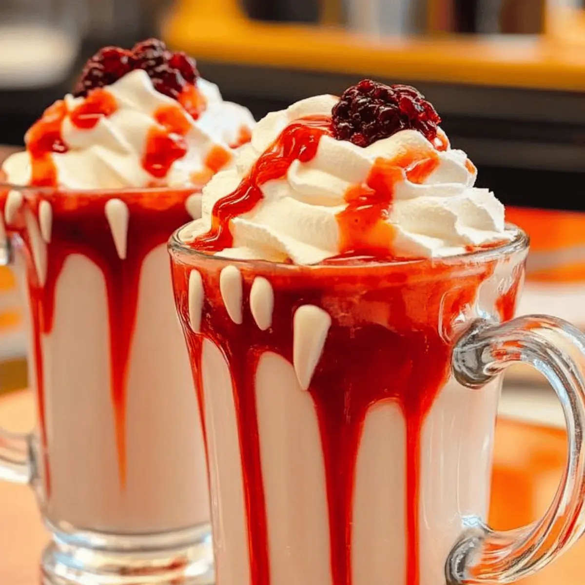 - Assemble the Vampire White Chai Hot Chocolate: Divide hot chocolate into two glasses, top with whipped cream, and drizzle with berry syrup.