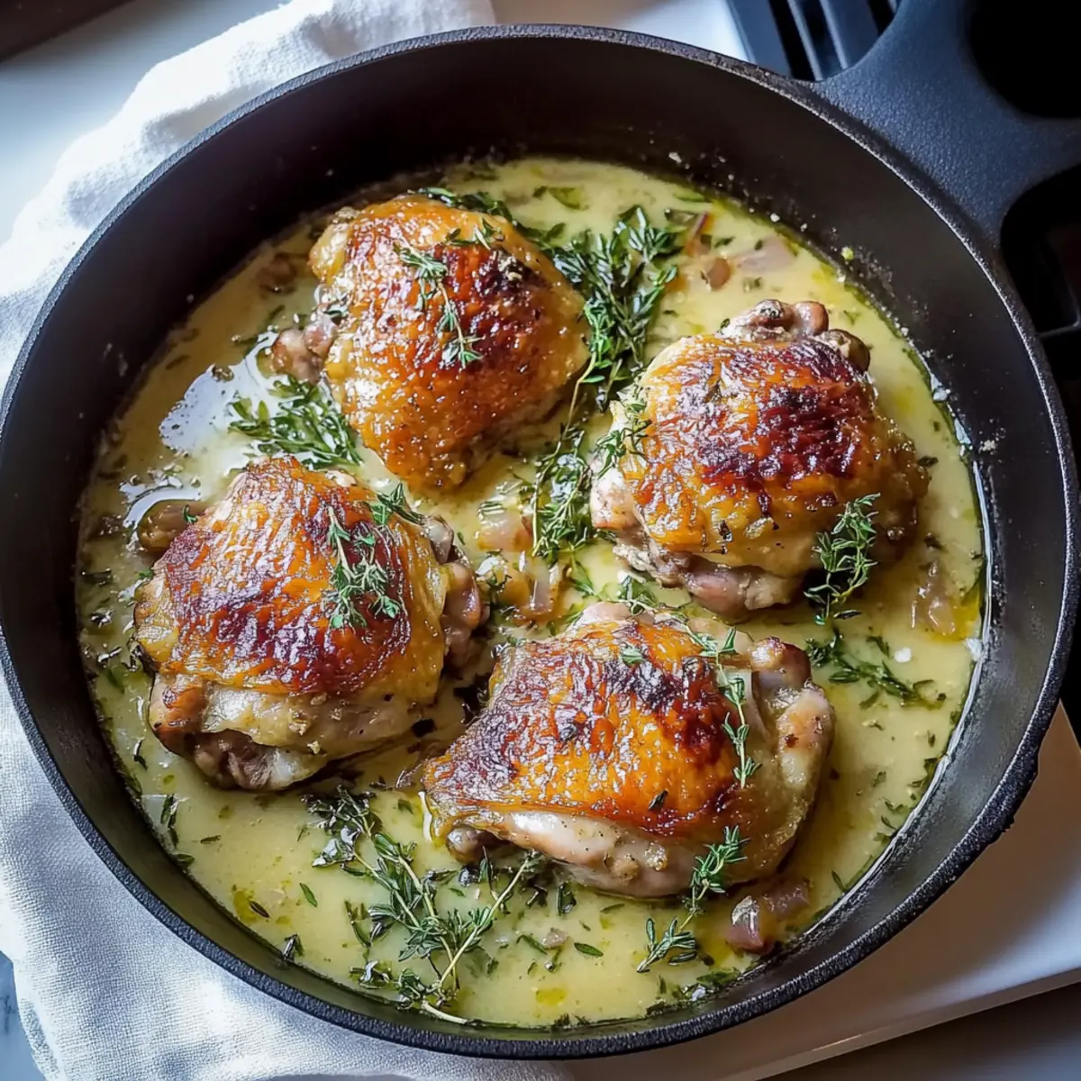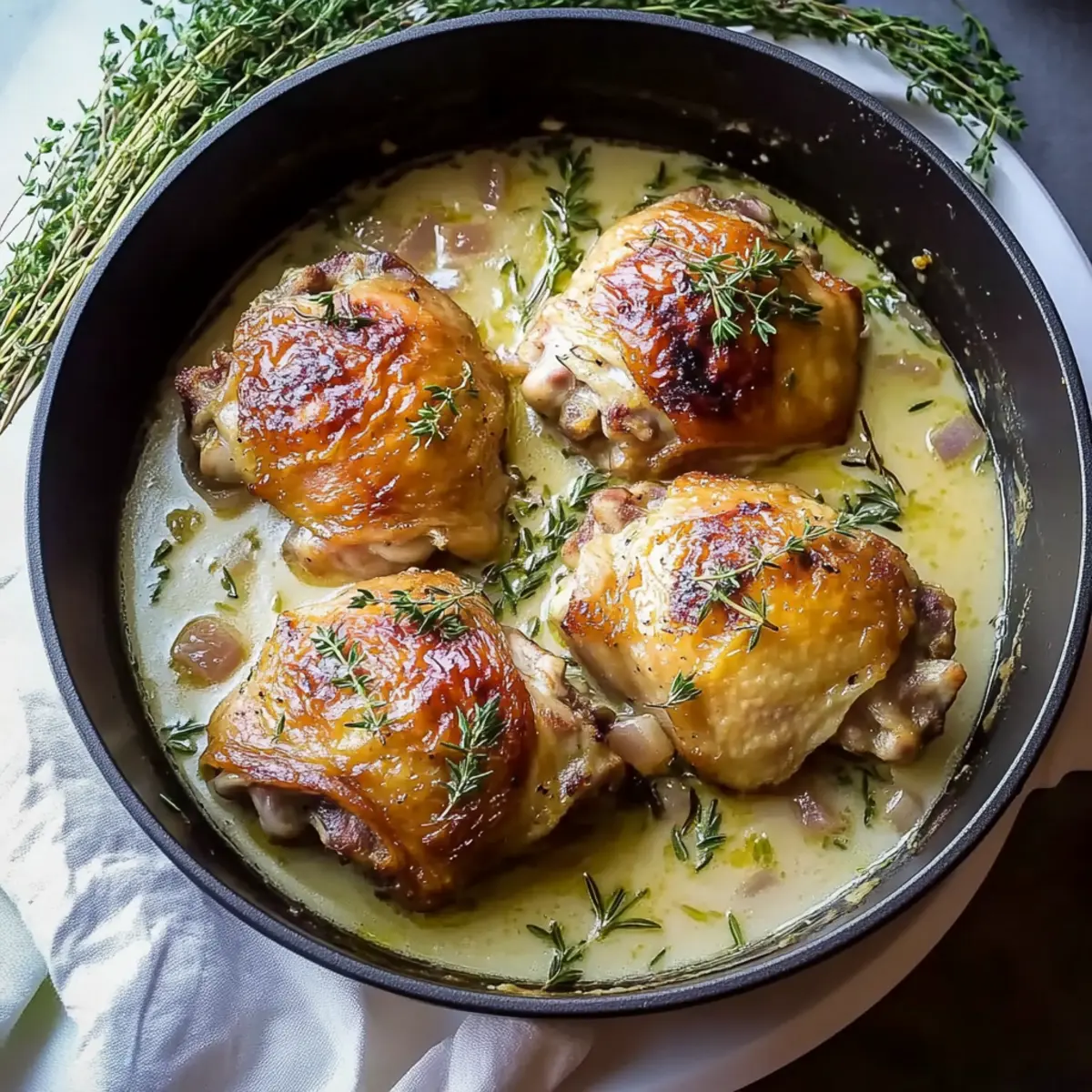 Once cooked, remove the skillet from the oven and take out the bay leaf. Allow the chicken thighs to rest for about 5 minutes to lock in their juices. For a luscious finish, if desired, stir in ½ cup of heavy cream into the hot sauce before serving for a creamier texture that elevates the dish even further.