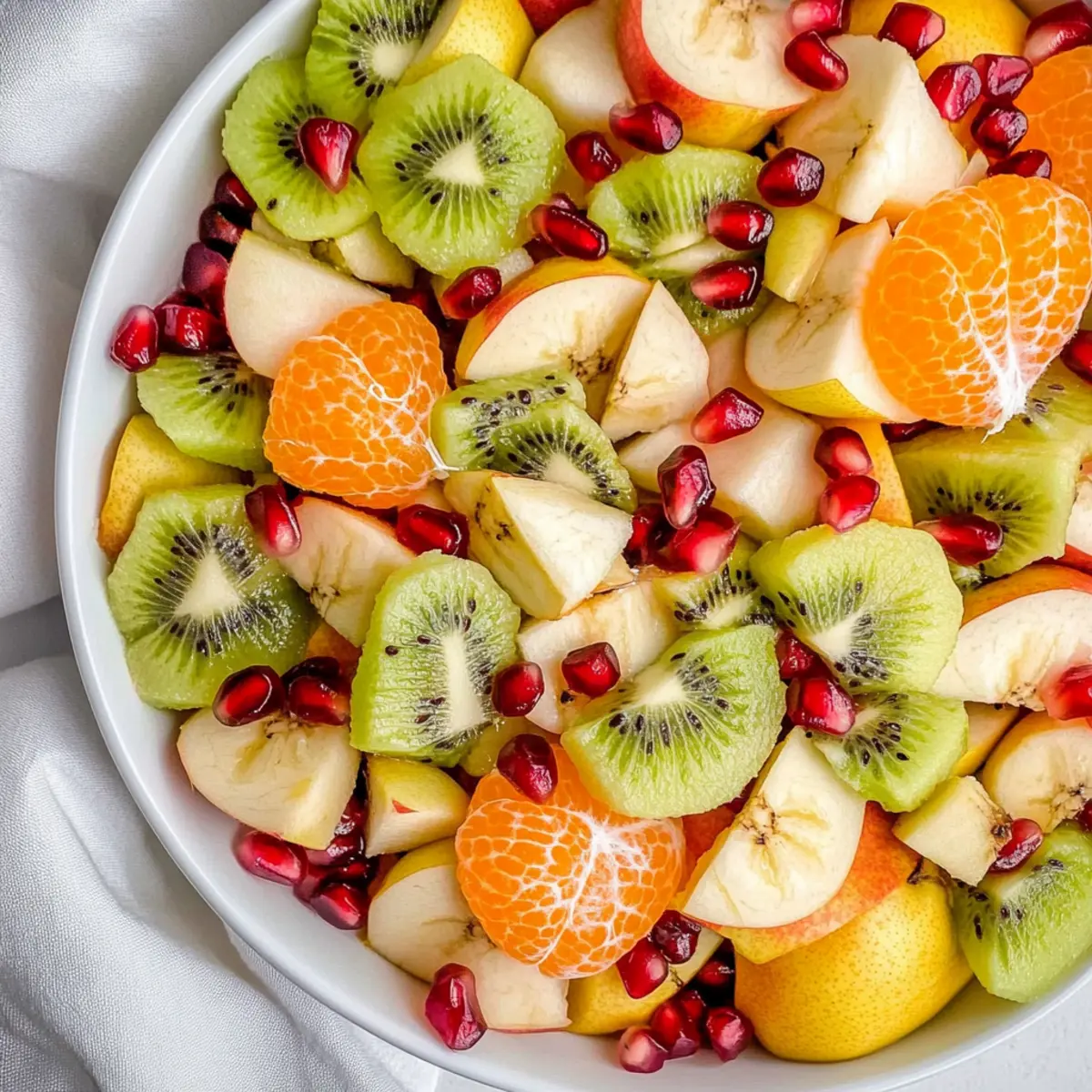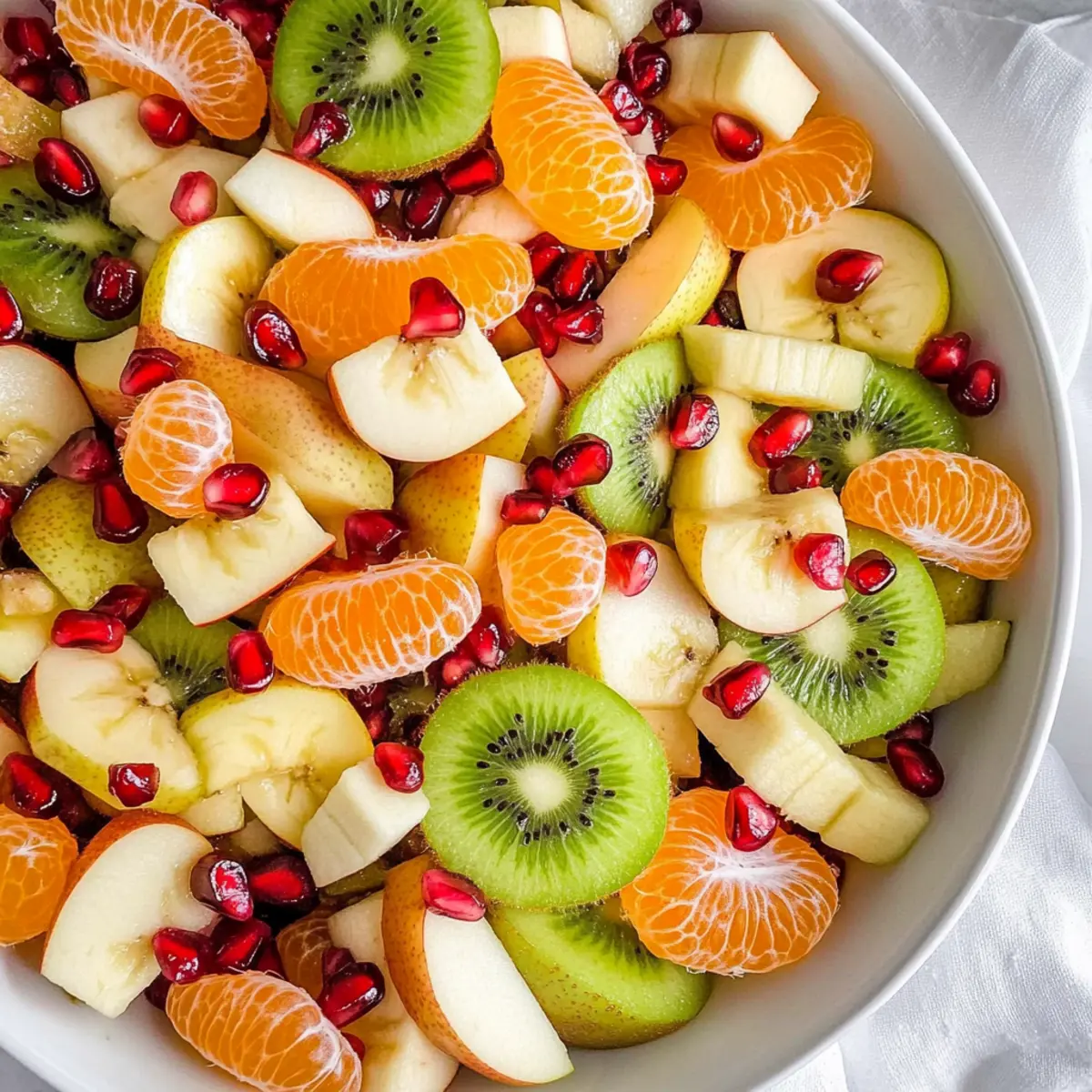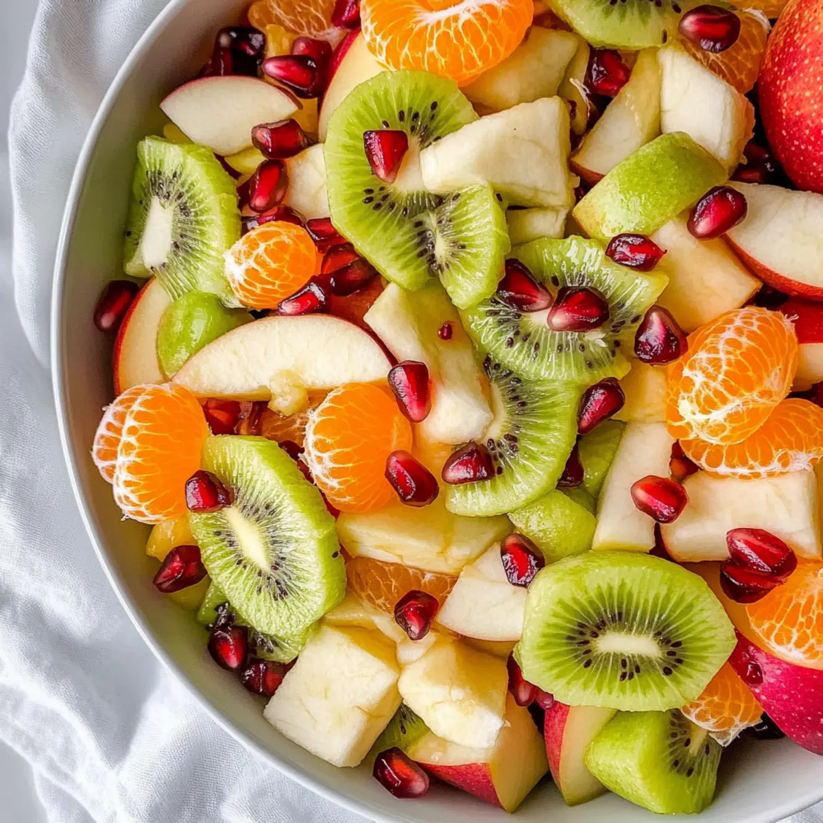 When selecting fruits for your Winter Fruit Salad, aim for ripe yet firm options. For kiwis, choose those with a little give when gently pressed, indicating ripeness without being overly soft. Clementines should feel heavy for their size and have smooth, shiny peels. Apples should be crunchy and tart, like Granny Smith, while pears can be slightly soft but not mushy. Pomegranate arils should be bright red and juicy; if they’re not available, you can substitute them with fresh blueberries instead.