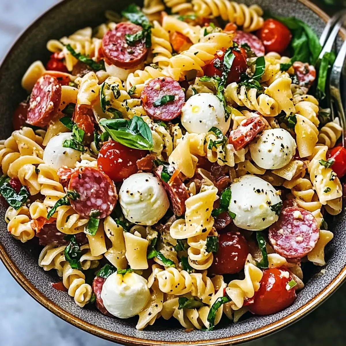 - In a large bowl, combine cooked pasta, mozzarella pearls, salami, pepperoni, pepperoncini, red bell pepper, and onion. Gently fold together.